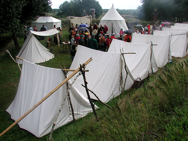 Living history camp of a Dutch re-enactment group. This camp was, as you can see, quite popular with tourists. Of interest are the tent poles.