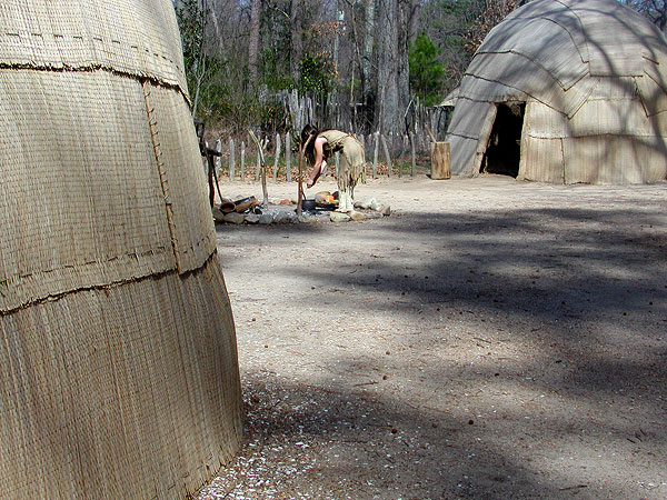 I now had an excuse to make the flight. Jamestown is approximately an hour and a half drive southeast of Richmond. The original site was thought to have been lost into the James River in its meanderings over the centuries. Fortunately, a couple of decades ago, an historian suspecting otherwise discovered that where the little town had stood had not been washed away. Inches below the ground's surface was a trove of early 17th century artifacts, including building foundations. An interesting irony is that Jamestown, in the New World, has offered one of the greatest collections of English artifacts from this period. This was the first English colony to "stick" in North America. Earlier efforts had failed or disappeared, like Roanoke. Jamestown began in 1607 and was named for (no surprise here) King James, the successor to Elizabeth (for whom the land claim was named). This was the storied site of Captain Smith, Pocahontas, lazy gentry, gold lust, and so on. Captain Smith, in his recollections, inflated his reputation by warping inconvenient facts, such as the work ethic of the colonists, who really did make an effort to build a productive colony but were nearly overwhelmed by new challenges, such as a muggy hot climate, biting insects, foul water, suspicious natives, and the most severe drought the region had experienced in about 400 years (based on tree-ring studies). Prospective income-producing ideas were floated about, such as glassmaking (with a very abundant wood supply for fuel easily at hand). But nothing worked profitably - or even well - until tobacco. Jamestown became an exporter of tobacco. Fields and new colonists spread forth into the new land (which the English claimed all the way to the Pacific Ocean). Jamestown remained the center of English presence until 1699 when the seat of Virginia government moved inland to Williamsburg, which was much less dank and buggy. All buildings exhibited are reconstructions, based on archeological findings. The original settlement was surrounded by a wooden palisade, put up primarily to defend against Spanish raiders. In addition to the reconstructed settlement and Indian village, the park has reconstructions of three of the ships that carried colonists (which were not just small but really cramped inside), a fine, rambling museum, paved roads and parking lots, an unexciting cafe, souvenir shops peddling gewgaws, jimjams and wingdings, and many other amenities of the 21stC.